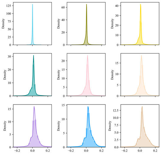 The histogram of prediction errors (the difference between the true value and the predicted value) for each predicted scene shows that the errors of the first nine scenes are concentrated within the range of (−0.2, 0.2) and almost follow a normal distribution. This undoubtedly indicates that the proposed model has a good predictive ability. When we observe the prediction errors along the time axis, we can see that the corresponding kernel density curve gradually widens and moves towards the positive direction with the in-crease in time, indicating that the corresponding standard deviation is continuously increasing, and the predicted values are gradually decreasing compared to the true values. This provides us with ideas and information sources for future improvement of the model.