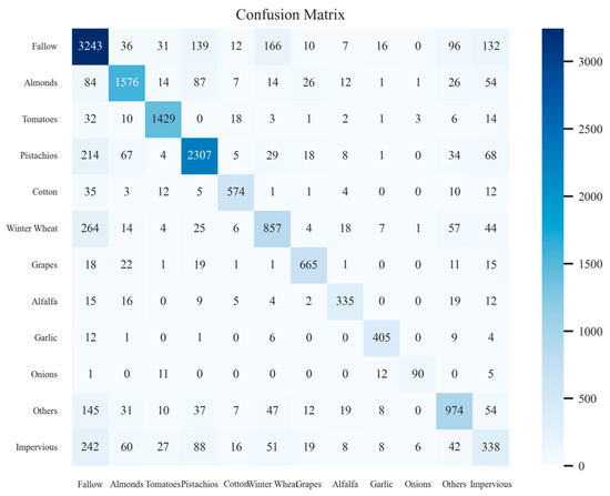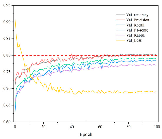 In the process of large-scale crop mapping, the training of the crop identification model is crucial as it directly affects the accuracy of the down-stream crop mapping task. Therefore, we first evaluated the training effectiveness of the crop classification model used based on the hyperparameters determined in the previous chapters. Among them, Figure 12 illustrates five evaluation metrics for crop classification accuracy during the training process and the trend of the loss function on the validation set. We can clearly see that the model’s loss function has become stable by around the 40th epoch, and the overall validation accuracy is maintained at around 80%. To improve the generalization ability of the model, we trained a classification model on a collection of crop samples from multiple years, as mentioned in the previous section, in order to enhance its robustness. Combining prior conditions such as label quality and sample type distribution, the final validation accuracy of the classification model is acceptable.