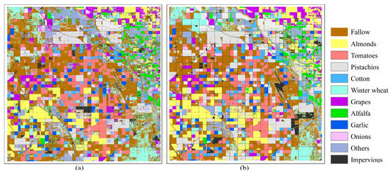 Regarding the spatial crop mapping results, we can clearly see significant changes in the pattern. Firstly, the salt-and-pepper noises in the crop mapping results gradually decreased. Secondly, for some crop parcels, the initial misclassification or omission gradually shifted to correct classification as the initial length increased. This change was most evident for others and impervious types, while some crop types, such as almonds and pistachios, showed little difference. At the same time, from the quantitative indicators in Table 7, we can see that the identification accuracy of almost all crop types improved with the initial data extension. Even the identification accuracy of the other types increased from 0.44 to 0.75. Surprisingly, when the available data in 2022 reached 25-time steps (around mid-June), the early crop mapping framework we proposed almost achieved the same accuracy as that of using data for the entire year. This result confirms the effectiveness of our work. Clearly, these changes align with our initial hypothesis that the longer the initial data length, the better the spatial–temporal prediction model’s prediction effect and the lower the accumulated error.