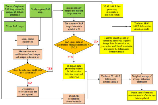The proposed method is divided into two parts. First, the Iterative Self-Organizing Data Analysis Techniques (ISODATA) algorithm is used to define the boundary between the slow subsidence region and the fast-subsidence region by clustering the distribution of land subsidence rates obtained by PS-InSAR. Second, when new SAR data are needed, SBAS-InSAR is used to efficiently develop small SAR data sets that include partial time-series SAR data and new SAR data. Moreover, the monitoring results are the sum of the latest results of SBAS-InSAR and the original result of the PS-InSAR for the time-series SAR datasets that are not included in the small SAR data sets. After updating with a certain amount of SAR data, the boundary and the monitoring results will be recalculated by PS-InSAR and SBAS-InSAR. The processed algorithm is partitioned into 10 steps, the procedure of which is shown in Figure 1.