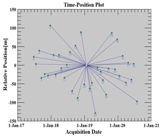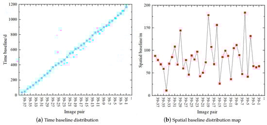 Master image are obtained from a 2D center consisting of temporal-spatial baselines during PS-InSAR processing (accessed on 22 February 2019). Then, 38 ascending Sentinel-1 images were co-aligned with the master image, moreover, a sum of 37 interferograms was derived from the data sets via interferometric processing. The produced spatial baselines were primarily distributed over the range of −130 m to −110 m, the longest spatial baseline was 121.802 m with a time baseline maximum of 600 d (Figure 4).