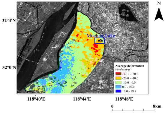 As presented in Figure 5 and Figure 7, the annual mean deformation rates in the PS-InSAR monitoring results ranged from −24.3 to 24.5 mm·a, while the annual average deformation rates in the SBAS-InSAR monitoring results varied from −32.1 to 19.8 mm·a. The number of PSCs in the fast-subsidence region in the PS-InSAR monitoring results decreases as the subsidence rate increases until becoming incoherent. In the SBAS-InSAR monitoring results, the incoherence areas occur primarily where the subsidence rate is greater than 20 mm·a. The regions of rapid subsidence are mainly located near the south of Mochou Lake, which should be monitored as a priority for residential areas and transport infrastructure.