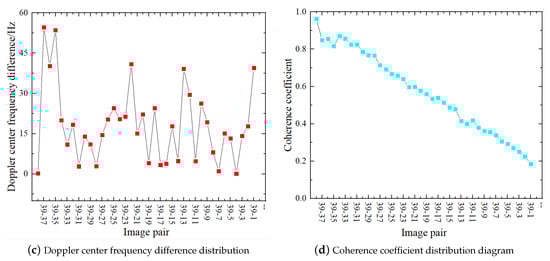 where n, l is the serial number of the master and slave images. represents a temporal baseline for the master and slave images. indicates the spatial baseline of the master and slave images. expresses the Doppler center frequency difference between the master and slave images. indicates a critical effective baseline. is a critical temporal baseline. denotes the critical Doppler center frequency difference. is the set of images meeting the filtering criteria (). is the master-slave image coherence coefficient () [,,].
