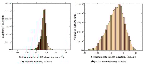 The statistical analysis of the PSCs yielded by PS-InSAR and the SDFPs yielded by SBAS-InSAR indicates that there are 86,578 PSCs and 149,366 SDFPs, and the total number of SDFPs is much greater than that of PSCs. The maximum deformation rates in the LOS direction for the PS and SDFP pixel points are −12 and −7 mm·a, respectively. Meanwhile, the frequency distribution pattern of the PS and SDFP pixel points is more similar in terms of the values of the deformation rates, as displayed in Figure 13.