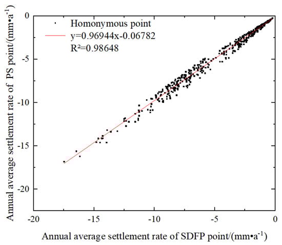 The 2761 PSCs and SDFPs with the same geographical coordinates in the research region have been screened, and the correlation analysis of the subsidence rates at the screened points indicates, that the linear correlation coefficient R exceeds reaches above 0.93, as displayed in Figure 14.
