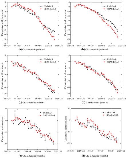 After comparing the variation in cumulative land subsidence over time in areas showing rapid land subsidence, characteristic points in the regions 0~10 mm·a, 10~20 mm·a, and 20~30 mm·a has been selected for plotting the time-series variation curves of cumulative land subsidence, where the characteristic points A1 and A2 are located in the region with a land subsidence rate of 20~30 mm·a. In addition, the characteristic points B1 and B2 are located in the region with a land subsidence rate of 10~20 mm·a, and C1 and C2 are located in the region with a land subsidence rate of 0~10 mm·a, as shown in Figure 15. The time-series variation profiles of accumulated subsidence at the feature points over set time are presented in Figure 16. The deviations in the accumulated subsidence monitoring values given by the two techniques have also been statistically analyzed.