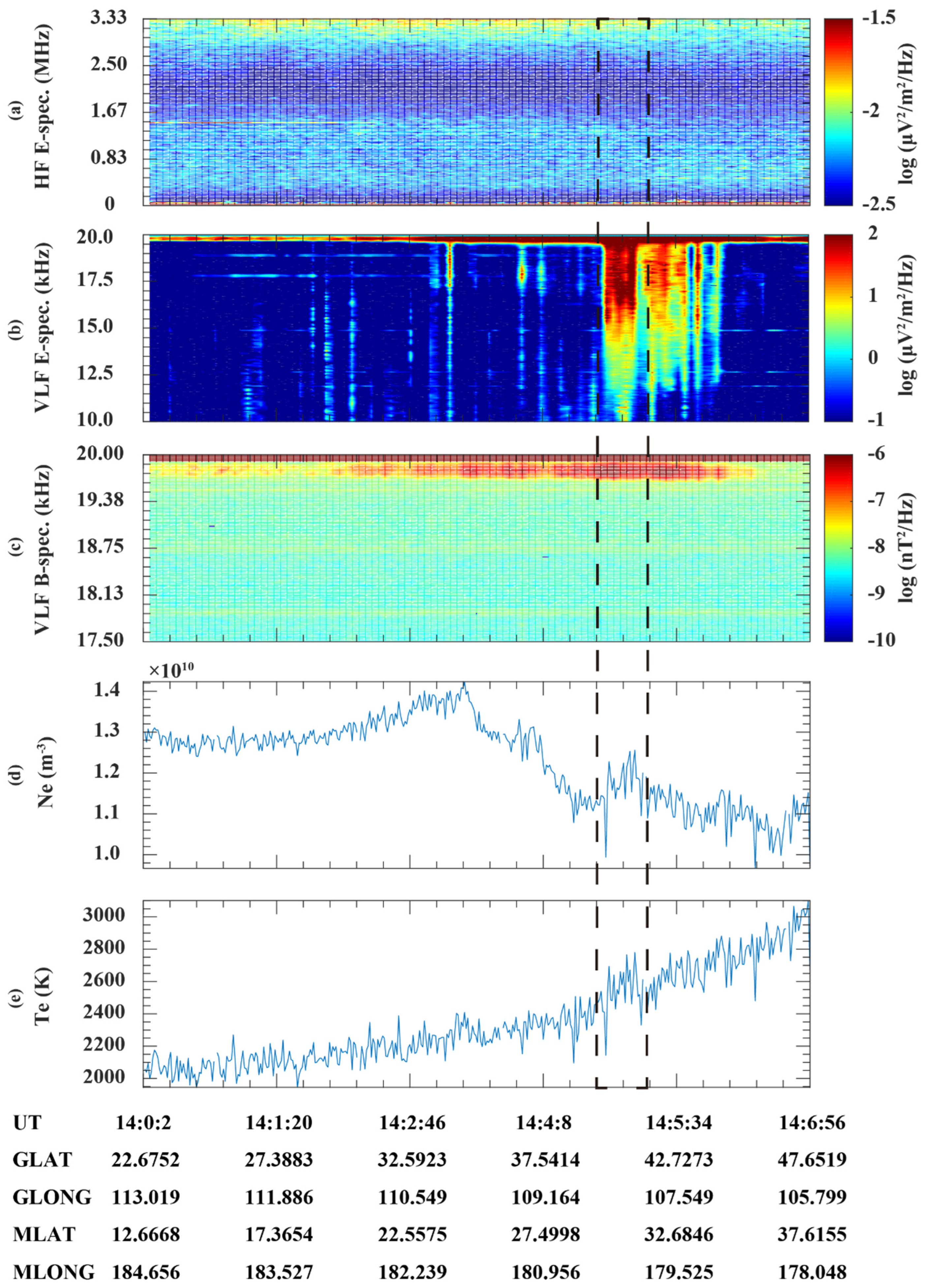 - Zhao, S.; Zhou, C.; Shen, X.H.; Zhima, Z. Investigation of VLF transmitter signals in the ionosphere by ZH-1 observations and full-wave simulation. J. Geophys. Res. Space Phys. 2019, 124, 4697–4709. [Google Scholar] [CrossRef]