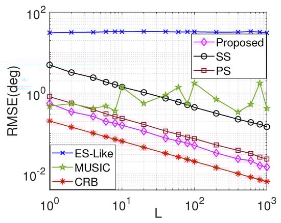 Figure 5 illustrates the comparison of average RMSE versus L, where , , , , . It can be observed that the RMSE gradually decreases as L increases for all the algorithms. Similar to the observation in Figure 4, the proposed algorithm provides the best RMSE performance over the entire L regions.