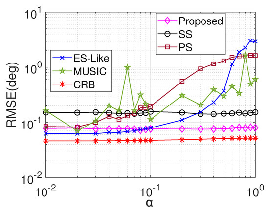 Figure 6 displays the average RMSE comparison versus α, where , , , , . An intriguing finding from our analysis is that ESPRIT delivers the most favorable RMSE performance when since sources in such conditions can be interpreted as non-coherent. In contrast, both SS and our proposed approach exhibit insensitivity to α, which indicates that correlated or fully coherent signals present in a multipath environment can provide stable 2D-DOA estimation. Furthermore, our proposed algorithm consistently delivers a superior RMSE compared to SS, PS and MUSIC.