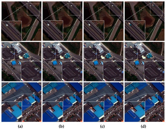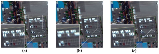 Figure 7 illustrates the SR process of the BLG-GAN model for real-world remote sensing images using LR image transfer to bicubic-like LR images. Once the real-world LR image (Figure 7a) is fed into the image transfer network, the input image is restored to a less blurry bicubic-like LR image (Figure 7b) with sharper edges. The subsequent SR network can use these edges to generate SR images with clear details. As shown in Figure 7c, the BLG-GAN successfully recovers various ground features, including road lanes, parking lines in the parking lot, and the rectangular shape of building roofs.