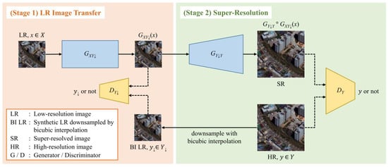 In LR image transfer, generator learns the mapping from the LR domain to the bicubic-like LR domain , as illustrated in Stage 1 of Figure 2. For the given input LR image x, generate a bicubic-like LR image , which looks similar to a synthetic LR image . This LR image transfer process can be formulated as: