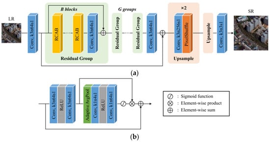 Architecture of the generators used in the proposed BLG-GAN: (a) generator with residual channel attention blocks (RCABs) [13]; (b) RCAB from the generator. and share the same framework composed of residual groups with RCABs. includes upsampling blocks to increase the size of the LR image by a factor of 4, whereas does not require upsampling blocks because the scale of input and output images do not change in LR image transfer.