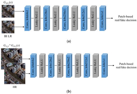 Architecture of the discriminators used in the proposed BLG-GAN: (a) discriminator for LR image transfer (); (b) discriminator for super-resolution (). and share the same discriminator structure based on patchGAN [42]. Considering the size of the input image, the stride of the first three convolution layers is set to one and two for and , respectively.