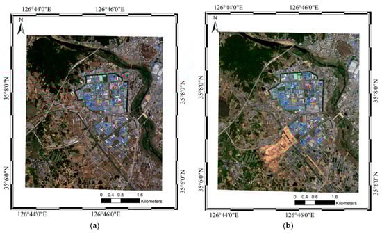 Remote sensing images used in this study; WorldView-3 (WV-3) images acquired over Pyeongdong Industrial Complex located in Gwangju, Republic of Korea, on (a) 26 May 2017 and (b) 4 May 2018.