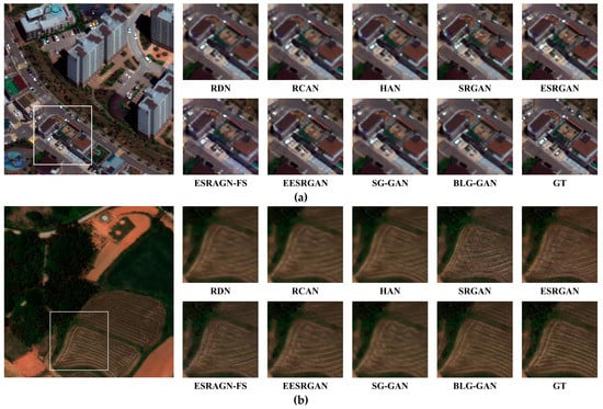 SRGAN [9] and ESRGAN [15] are widely recognized studies that introduced GANs to solve the SR problem, and their basic structures have been adopted by many researchers. ESRGAN-FS [40] builds upon the structure of ESRGAN and incorporates a frequency separation training strategy. As these GAN-based models were originally developed for images used in computer vision, we also compared our method with two GAN-based SR methods designed for remote sensing images: EESRGAN [21] and SG-GAN [22]. EESRGAN is an improved model based on EEGAN [20], which aims to enhance the edges extracted from an image by adding an edge-enhancement network to the back of the generator. On the other hand, the SG-GAN adopts a salient object detection network [49] at the rear of the SRGAN-based generator, leveraging saliency information to generate more detailed SR outputs.