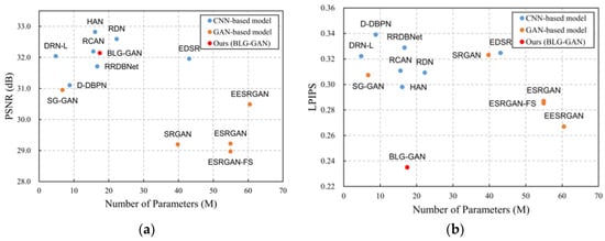 Comparison of the number of network parameters (M) and SR performance using (a) PSNR and (b) LPIPS metrics. The proposed BLG-GAN model is indicated as a red point and the CNN- and GAN-based models are shown as blue and orange points, respectively.
