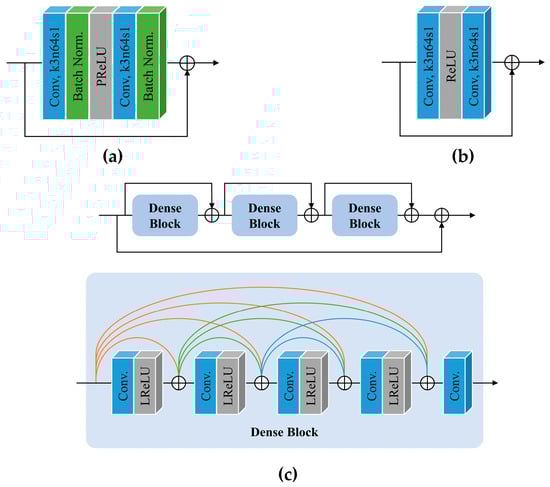 We compared the SR performance of the generators using four different basic blocks: the residual block from SRResNet [9], the residual block based on ResNet-18/34, the residual in residual dense block (RRDB) from ESRGAN [15] (Figure 9), and RCAB from RCAN [13] (Figure 3b). The residual block from SRRestNet consists of two convolutional layers followed by batch normalization (BN) and uses ParametricReLU (PReLU) as the activation function [9] (Figure 9a). The main difference between the residual blocks from SRResNet and ResNet-18/34 is whether the block contains BN layers or not. Previous studies [11,15] have shown that BN layers are preferentially removed from the SR network because normalization of the features can restrain the generalization ability and deteriorate the SR performance. The RRDB also eliminates BN layers from the block architecture and integrates dense connections into a multilevel residual network to increase the network capacity. As mentioned in Section 2.3, the RCAB was proposed as a basic block for RCAN [13]. The RCAN model is based on the RIR structure with multiple residual groups. Each residual group comprises RCABs, which utilize a channel attention mechanism to extract more informative features from the input.