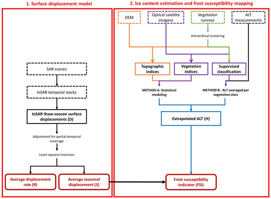 Workflow of the methodology used in this study. Raw data are represented by dashed boxes, intermediary products by colored boxes, and final products are highlighted in red. Step 1 consisted of the synthetic aperture radar (SAR) scene processing, production of yearly thaw season surface displacement (D) maps, and retrieval of average seasonal displacements (S) and average displacement rates (R). In step 2, ground truth data, satellite optical images, and a digital elevation model (DEM) were used for classification of the land cover and for computation of vegetation and topographic indices. These inputs were used to extrapolate ALT measurements over the study area. Finally, a frost susceptibility index (FSI) was calculated from extrapolated ALT and S.