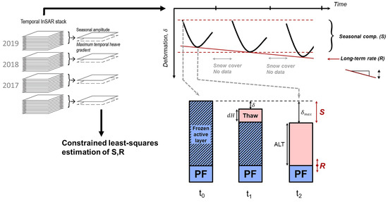 At the onset of the thaw season, the active layer is fully frozen. As the soil starts to thaw (Figure 3), the AL progressively deepens (dH). Melting of the ice in the AL gives rise to volume changes and associated subsidence (), until the AL has finally reached its maximum thickness (referred to in our paper as the ALT or H). Assuming surface deformations are caused exclusively by pore water phase changes in the soil column, and that lateral exchanges of water do not occur, the total subsidence reached at the end of one thaw season () can be correlated to the amount of ice melted. The latter consists of ice formed during the previous year’s winter freeze-up of the AL and possibly ice contained in the transient layer at the top of permafrost, in the case of permafrost degradation.