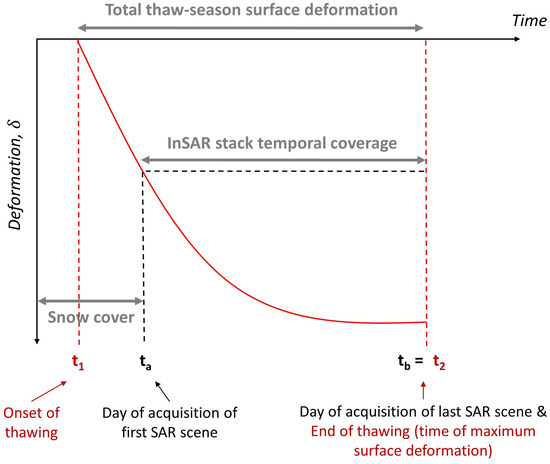 Schematic representation of total thaw season surface displacement versus partial temporal coverage of the InSAR stack. The thaw season displacement is initiated at the onset of thawing and reaches its maximum at time . The first scene in the InSAR dataset is acquired at time , after the snow melt, and the last scene is acquired at time , corresponding to the time of maximum surface deformation .