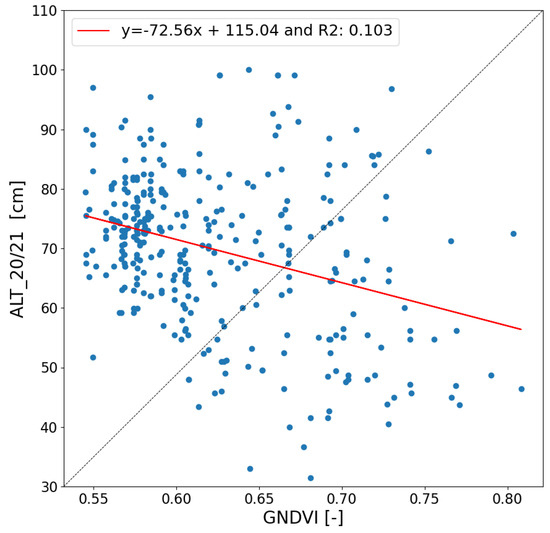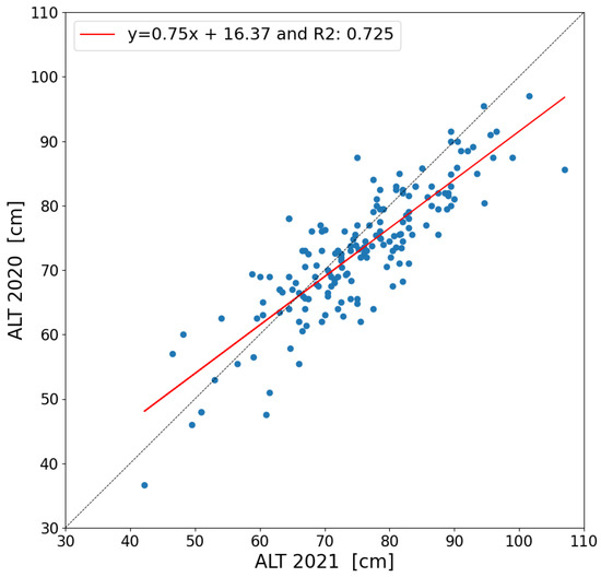 In order to preserve the greatest number of observations, ALT locations that had been exclusively measured in 2021 were recalculated for 2020. To this end, a linear regression was fitted on measurements undertaken both in 2020 and 2021 (Figure 5). In the rest of the paper, we refer to this dataset as .