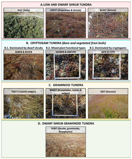 As a way to map local vegetation, floristic surveys were conducted at distributed locations and concurrently along ALT transects. Due to time constraints, the floristic composition (species identification) and Braun–Blanquet (BB) indices of abundance–dominance [52,53] were assessed only once per surveyed homogeneous vegetation unit. At each location, the vegetation was photographed and sampled within a 20 by 20 cm quadrat (September 2020) or 50 by 50 cm quadrat (September 2021). BB indices were converted to percent cover for each of the main plant functional types (PFT) [54], categorized as: non-vegetated (NV), shrubs (S), graminoids (G) including the subcategories grasses (GG), tussock sedges (GTS), non-tussock sedges (GS) and rushes (GR), forbs (F), bryophytes (B), lichens (L) and pteridophytes (P) (Figure A2, Appendix A.2). Periglacial and geomorphological features were described at each survey location, and surface drainage conditions were qualitatively assessed with a scale ranging from very dry to partly inundated.