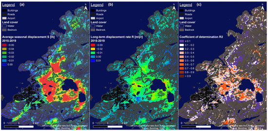 Although ground thaw begins in early May in Ilulissat, parts of the area may still be snow-covered. In order to avoid de-correlation and phase anomalies from the snow cover, SAR scenes acquired from October to May were removed from the stacks. Gaps that resulted from de-correlated scenes had to be filled by bridging interferometric pairs that would form coherent interferograms again. This implies that the onset of thawing may not be covered by the temporal InSAR stack and is thus not included in the time series of total cumulative displacement. As a result, the displacement is underestimated [20,23], and corrections need to be applied. Offset correction based on Accumulative Degree Days of Thawing (ADDT) has been suggested and demonstrated as applicable [20].