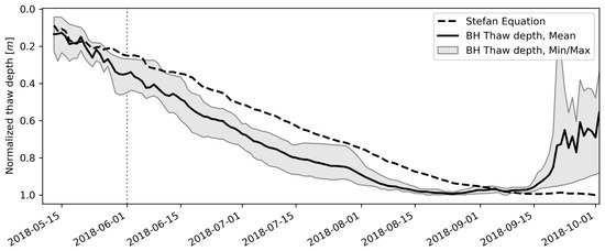 The Stefan equation [37] is an analytical solution originally developed to describe sea ice formation, later applied to the freezing of soils by Berggren [38] and to the estimation of thaw depths by, e.g., Hinkel and Nicholas [39]. Widely used as a first approximation, the thaw depth at time t, , may be estimated using the Stefan equation as follows: