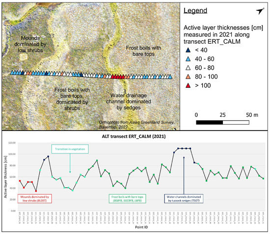Active layer probing was undertaken every year from 2015 to 2021 (except for 2017) at Ilulissat’s Circumpolar Active Layer Monitoring (CALM) site. The CALM site is a 50 × 50 m grid of 111 points located in a homogeneous zone of frost boils dominated by cryptogams and dwarf shrubs. ALT was additionally measured in 2020 and 2021 at 36 locations spread across the study area. In order to better understand the influence of surface characteristics on the ALT distribution, six transects crossing different landforms and vegetation units were probed in 2020 and 2021. AL probing was always conducted at the end of thawing seasons (when the AL had reached its maximum) with a 110 cm graduated metal rod (ALT probe). The measurement was generally repeated from two to five times at each location, and the values were averaged. The accuracy of the measurements is on the order of 1 cm.