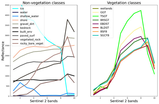 Training and validation samples were secondly prepared by extracting representative pixels of non-vegetated and vegetated units within each image band. On average, 80 to 100 pixels were picked for each class of the training dataset, while 40 to 60 were picked for each class of the validation dataset. The previously defined vegetation classes were used to inform the selection process. Spectral distances and signatures of the training samples were computed to ensure sufficient spectral separability between the classes. Classes with low separability were merged, resulting in seven final classes (described in Table 1 and Table 3).