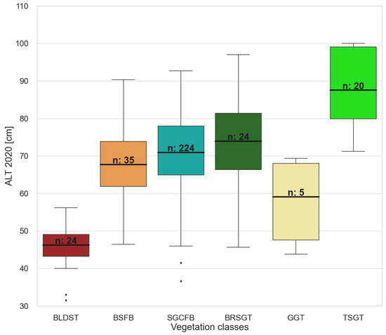 Several studies, e.g., [42,43,44,45,46,47], demonstrated the influence of topography and environmental factors (hydrology, vegetation cover, landforms, snow cover) on ALT. Vegetation first strongly influences the surface energy balance, snow cover, soil moisture, and organic content [47]. Vegetation composition and canopy height may consequently provide valuable information on permafrost properties and ALT [42]. In addition, biophysical and physiological properties of plants confer singular spectral reflectance signatures to distinct vegetation units [48]. Topography and microtopography secondly influence vegetation distribution and snow accumulation. As demonstrated in previous studies [43,45,49,50], terrain attributes can therefore be used as an alternative or complement to land cover maps to extrapolate ALT.