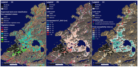 Both optical and radar satellite data have been tested for statistical and empirical relationships [15]. They were notably used to model ALT based on correlations with surface characteristics, e.g., [43,44,45,47,51]. We therefore investigated the spatial distribution of ALT and its relationship with vegetation and topographic variables derived from remote sensing. Based on established correlations, ALT measurements conducted over the study domain were extrapolated and finally used as inputs in Equation (14) to estimate the AL ice content and to derive FSI values. We finally validated the InSAR displacement and FSI maps with geotechnical data collected during the study period.