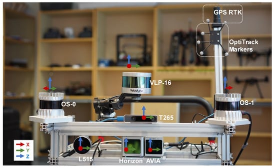 Figure 2. Front view of the multi-modal data acquisition system. Next to each sensor, we show the individual coordinate frames. - 3.