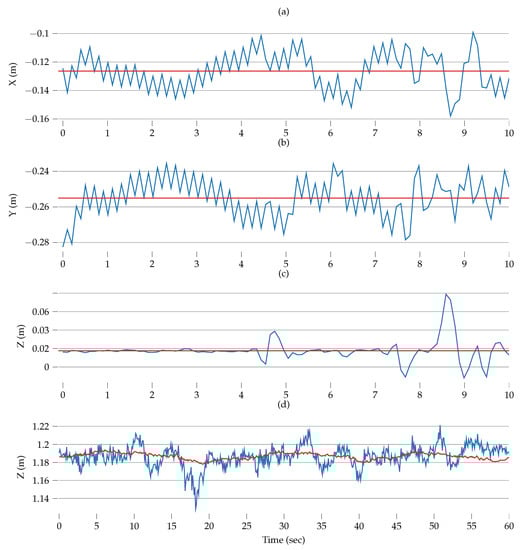 (a–c) Ground truth position values for the first 10 s of the dataset when the device was stationary. Red lines show the mean values over this period of time. (d) Comparison of NDT-based ground truth z-values (blue) to MOCAP-based z-values (red) over the course of 60 s of the dataset while the device was in motion.