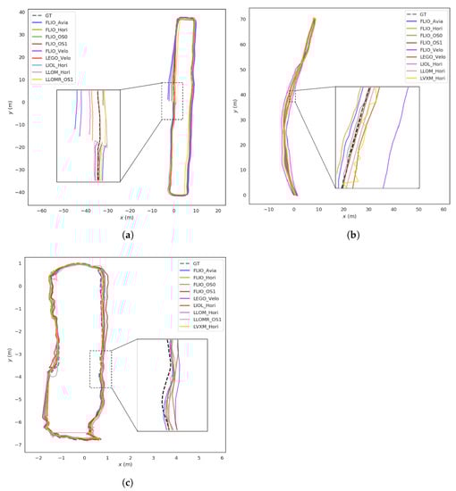 Demos of trajectories generated by multiple 3D LiDAR SLAM based on data from indoor, road, and wild environments. (a) Trajectory comparison of sequence Indoor10; (b) trajectory comparison of sequence Road03; (c) trajectory comparison of sequence Forest01.
