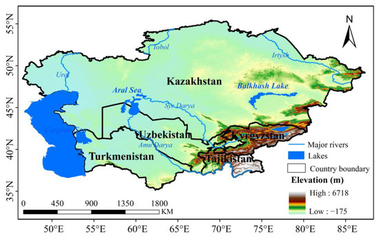 With a total area of 566 × 104 km2, central Asia (CA) is situated between the latitudes of 30° 20′N and 50° 30′N and the longitudes of 46° 30′E and 96° 30′E (Figure 1). Kazakhstan (KAZ; 272.49 × 104 km2), Kyrgyzstan (KGZ; 19.99 × 104 km2), Tajikistan (TJK; 14.31 × 104 km2), Turkmenistan (TKM; 49.12 × 104 km2), and Uzbekistan (UZB; 44.74 × 104 km2) are the five nations that make up CA. [21,22]. These states are present in the hinterlands of the Eurasian continent and have complex terrains and geomorphic features, including major lakes, rivers, and seas, such as Balkhash Lake, Issyk-Kul Lake, the Aral Sea, Syr River, and Amu River [23,24]. The study area of CA is known for its diverse geography and varying elevations and climates, which support a range of ecosystems and habitats. This region is also home to a rich cultural heritage, with ancient trade routes and Silk Road cities that have shaped its history and development. Studying this area is important for understanding the complex relationships between natural systems, human societies, and environmental changes. This has significant implications for water resource management, agriculture, biodiversity conservation, and sustainable development in the region.