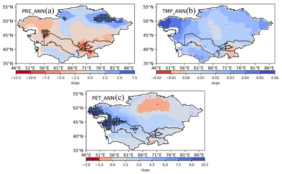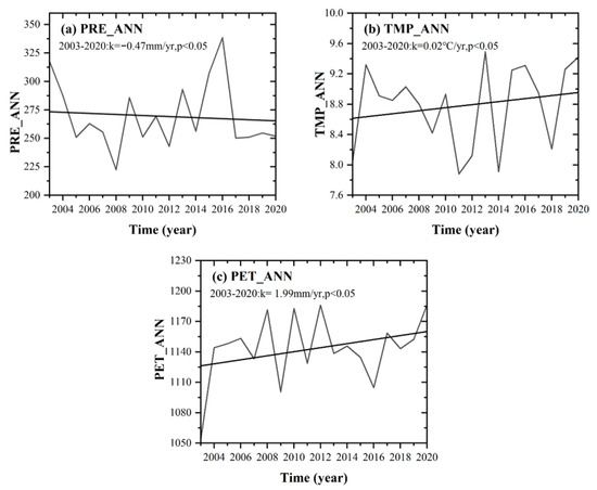Spatial distributions of the linear trends of the (a) annual PRE, (b) annual TMP, and (c) annual PET during the period of 2003–2020.