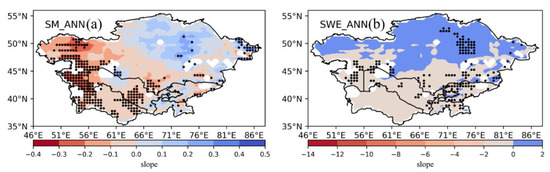 Spatial variation in the annual (a) soil moisture and (b) snow water equivalent trends in central Asia (linear trend).