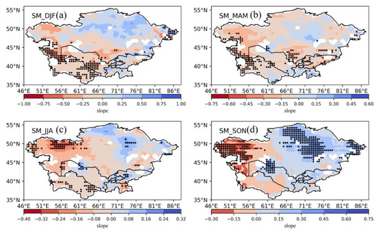 Spatial variation in seasonal SM trends: (a) December, January, and February; (b) March, April, and May; (c) June, July, and August; and (d) September, October, and November in central Asia.