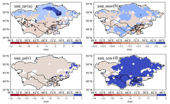 The spatial distribution of linear trends of seasonal SWE was evaluated over 18 years from 2003 to 2020. Figure 6 shows the linear trends of seasonal SWE during MAM, JJA, SON, and DJF. Positive linear trends in seasonal SWE were observed over the northern and eastern regions of the study area, except for areas showing the greatest increase in SWE (Figure 6). These trends differ from the increasing trend observed for the annual SWE. During SON (Figure 6d), the SWE increased in most areas, but a significant drying trend was observed in KGZ, KAZ, TJK, UZB, and TKM. However, the northeastern and southeastern KAZ showed a significant increase in SWE of 78%. During JJA (Figure 6c), the SWE showed a significant increasing trend in the northeastern KAZ and southern TJK, whereas most areas showed a decreasing trend, except for southeastern TJK. Conversely, during MAM and DJF (Figure 6a,b), larger areas showed increasing trends than during DJF and SON. Regions showing increasing trends were mainly distributed in KAZ. We observed that the SWE in the western parts of the arid region of KGZ decreased slowly during spring, whereas it increased as a whole in autumn, wherein the speed of increase gradually decreased from northern KAZ to southern and eastern TJK.