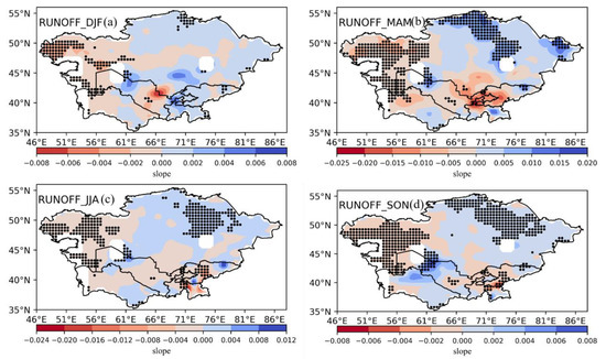 In this section, we analyze the temporal and spatial characteristics of a crucial climate variable, runoff, by examining its linear trends from 2003 to 2020. We primarily focused on the annual and seasonal variations in runoff, which can provide valuable insights into the components of the terrestrial water cycle. The goal of this study was to gain a deeper understanding of changes in the runoff in CA.