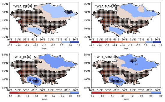 Figure 10 shows the spatial distribution of linear trends in the surface TWSA during the vegetation period from 2003 to 2020 for four seasons: MAM, JJA, SON, and DJF. Positive linear trends in the TWSA during the growing season were observed in the northern and eastern regions of the study area, except for areas with the most decreased TKM TWSA (Figure 10b). These trends differ from the decreasing trend observed in the annual TWSA (Figure 9). For instance, during MAM (Figure 10b), the TWSA decreased in most areas, and a significant drying trend was observed in KGZ and KAZ. However, southwestern KAZ, northwestern TKM, and eastern TJK experienced a significant decrease in TWSA of 47%, but positive trends were observed in northeastern KAZ (with a value of 27%). During JJA (Figure 10c), the TWSA showed a significant increasing trend in northwestern KAZ, central TKM, and southern UZB, whereas most areas showed a decreasing trend, except for southwestern KAZ and western TKM. Conversely, during SON and DJF (Figure 10a,d), larger areas showed decreasing trends than during MAM and JJA. The regions showing increasing trends were mainly distributed in KAZ and TKM. We observed that the TWSA in the southwestern parts of the arid region of KAZ decreased slowly during spring, whereas it increased as a whole in autumn, wherein the increasing speed gradually decreased from northeastern KAZ to southern and eastern TJK and TKM.