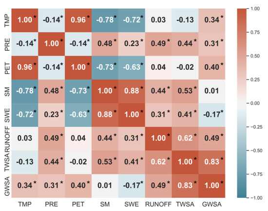The CC values for PRE, TMP, PET, SM, SWE, RUNOFF, TWSA, and GWSA. The * represents that the significance of CC should be a negative or positive trend, indicating the comparison of the terrestrial water cycle component with the seventh climate factor.