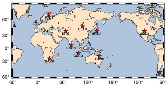 The distribution of the stations is presented in Figure 2. Due to differences in the satellite visibility from site to site, the selection of stations across the globe allows us to get a clear insight into the expected performance that is globally applicable and not location-restricted. The sampling frequency of static experimental data collected by the MGEX stations is 30 s. The static experimental data were processed using the kinematic model. To simulate PPP PAR hourly solutions, restarts were performed every hour.
