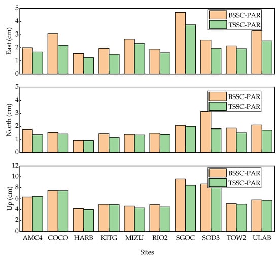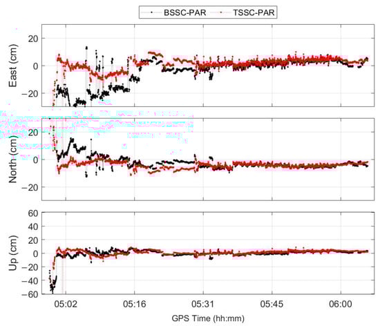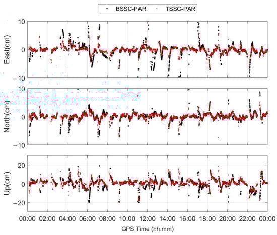 The positioning accuracy of the east, north, and up for the BSSC-PAR and TSSC-PAR.