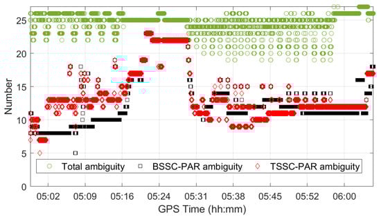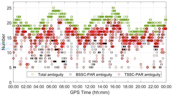 Figure 3 shows the positioning accuracy of the BSSC-PAR and TSSC-PAR for the AMC4 station in the east, north, and up directions. It can be clearly observed that the positioning accuracy of TSSC-PAR is significantly improved in the east, north, and up directions, compared with the BSSC-APR. As shown in Table 2, the TTFF and convergence time of TSSC-PAR are 4.3 min and 7.7 min, respectively, which is an improvement of 28.3% and 18.9%, respectively, compared with the BSSC-PAR. Furthermore, the positioning error RMS of TSSC-PAR are 13.1 mm 11.5 mm, and 42.5 mm in the east, north, and up directions, respectively, with an improvement of about 23.4%, 5.7%, and 8.2% compared with the BSSC-PAR. Figure 4 shows the number of ambiguity-fixed for the AMC4 station on the 116th day of 2022. The inaccurate variance of the ambiguity parameter due to the lower quality of the observations affects the accuracy of the ambiguity selection by the BSSC, while the TSSC-PAR uses the POWC to select a subset of ambiguities with inaccurate variances. As shown in Figure 4, during the convergence phase of the PPP, the number of ambiguity-fixed for the TSSC-PAR is higher than that for the BSSC-PAR. Combined with Figure 3 and Table 2, TSSC-PAR shows a more significant improvement in positioning performance during the convergence phase of PPP compared with the BSSC-PAR. It means that the ambiguity subset selected by TSSC-PAR is more accurate than the one selected by BSSC-PAR. Furthermore, compared with BSSC-PAR, the average number of ambiguity-fixed for TSSC-PAR increased from 14.4 to 15.1.