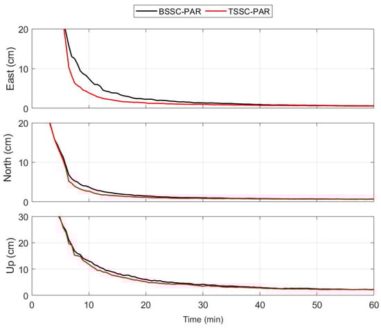 Convergence series of the BSSC-PAR and TSSC-PAR for 68% quantile of the east, north, and up in 1 h pass.