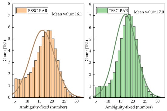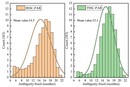 To further investigate the performance of the BSSC-PAR and TSSC-PAR at the AMC4 station, the data from DOY 116-DOY 145 in 2022 were analyzed. Figure 5 shows the convergence series of the BSSC-PAR and TSSC-PAR for 68% quantile in the east, north, and up directions. From Figure 5, we can see that the convergence series for the TSSC-PAR is better than that for the BSSC-PAR. Additionally, compared with the BSSC-PAR, the east convergence trend of TSSC-PAR is significantly improved. As is shown in Figure 6, the cumulative frequency of the TTFF and convergence time for the TSSC-PAR are better than the BSSC-PAR. As shown in Table 3, the RMS of positioning error for TSSC-PAR are 15.1 mm, 13.9 mm, and 47.5 mm in the east, north, and up directions, respectively. There is an improvement of 25.2%, 22.3%, and 10.8%, respectively, compared with the BSSC-PAR. Furthermore, the average TTFF and convergence time of the TSSC-PAR are 4.8 min and 7.3 min, respectively. Compared with the BSSC-PAR, the TSSC-PAR has an improvement of 11.1% and 21.5%, respectively. Figure 7 shows the distribution of the ambiguities-fixed number for BSSC-PAR and TSSC-PAR. From Figure 7, we can see that the distribution of the ambiguity-fixed number for TSSC-PAR is better than that for BSSC-PAR. Combined with Figure 5 and Figure 6 and Table 3, with the increase of the ambiguity-fixed number, the positioning performance of the TSSC-PAR is better than the BSSC-PAR. Based on the multiday data in the AMC4 station, it can be concluded that the TTFF, convergence time, and positioning accuracy of the TSSC-PAR are superior to that of the BSSC-PAR.