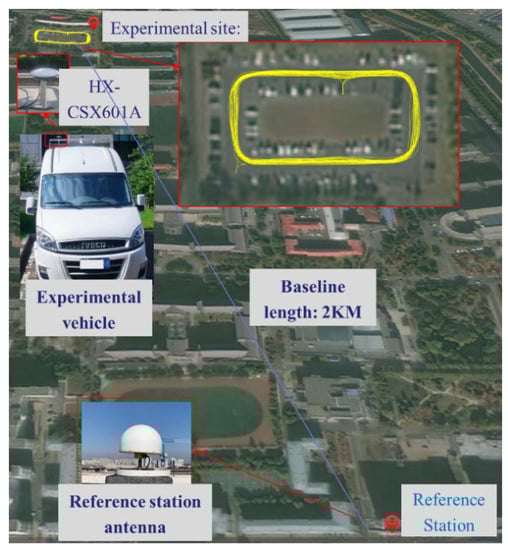 Table 5 summarizes the basic information from kinematic experiments. Figure 11 shows the reference station position and vehicle trajectory, where the longest baseline between the reference station and the vehicle is 2 km. RTK can obtain centimeter-level or even millimeter-level positioning accuracy. Therefore, we use fixed solution RTK of BDS/GPS combination by RTKLIB software as the reference true value, which is used to evaluate the performance of the TSSC-PAR and BSSC-PAR.