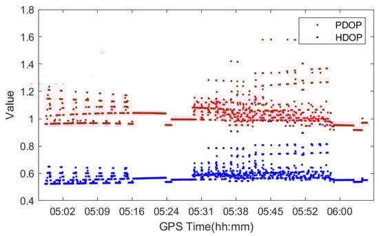 PDOP (red) and HDOP (blue) of the kinematic experiment.